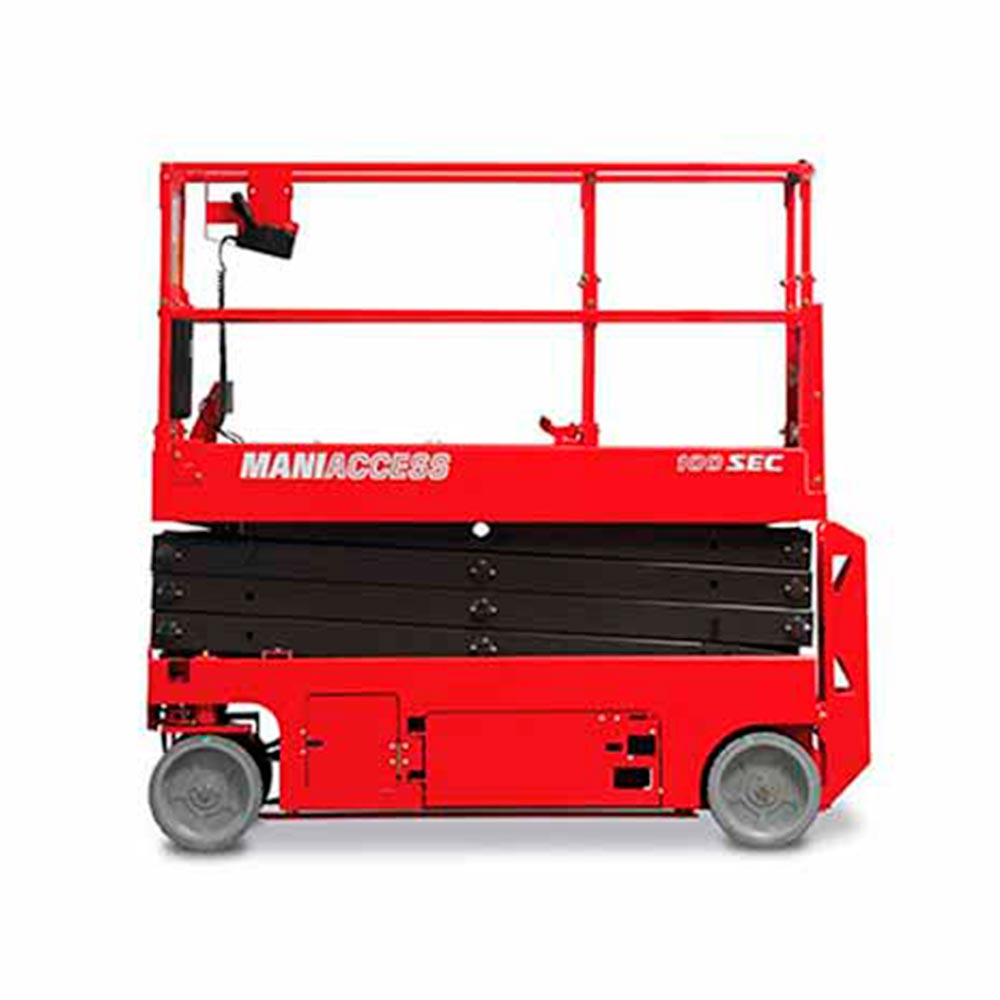 Su amplia plataforma de trabajo ofrece una gran ventaja de capacidad de superficie, evitando así no tener que tener repetidas subidas y bajadas. Además, permite el trabajo de varias personas en su plataforma. Su altura máxima de trabajo es de 12,2m y su motor es eléctrico.